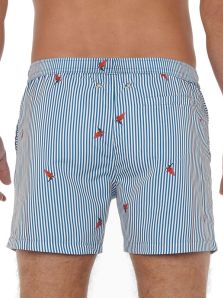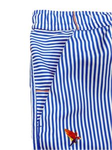 Acabado con las clásicas rayas combinadas en blanco y azul con un papagayo en vivos colores y perfectamente perfilado que rompe con el estilo tan formal que suelen tener este tipo de prendas.