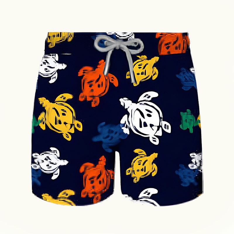 Nueva prenda de baño estampado con tortugas en diferentes tamaños y colores contrastando así sobre el fondo en azul marino.