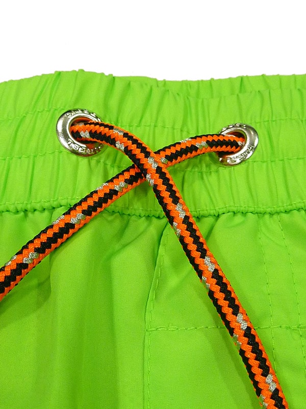 Logo del indio Mohawk engomado en el lateral izquierdo en verde oscuro contrastando con el color de la prenda. Destaca el logo de Diesel que va en blanco. Solamente tiene un bolsillo en la parte trasera cerrado con cremallera y solapa. Cordón ceñidor para un ajuste óptimo de la prenda en tono naranja y negro.