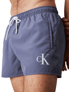 Logo CK en tamaño medio sobre el muslo de la pierna izquierda contrastado en blanco roto sobre el tono gris de la prenda.