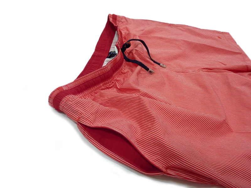 Bañador de corte clásico para hombre, color rojo a rayitas muy finas.