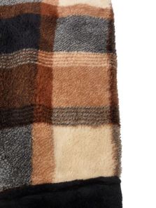 Un diseño súper chulo con cuadros grandes que cambian del beige al naranja y tonos tierra y realzado por vivos en negro para los bolsillos y el cuello de la bata.