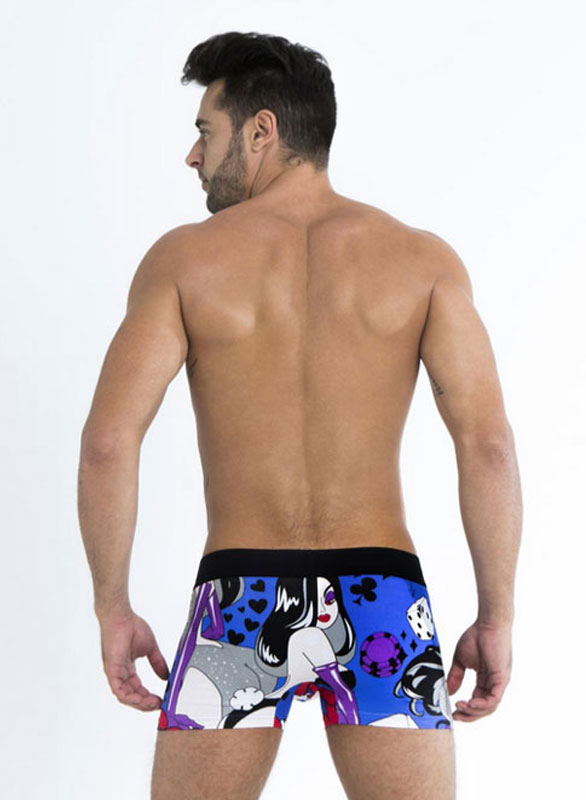 Nuevo modelo de calzoncillo de pierna media, confeccionado en algodón elástizado. Éste modelo "Sexy" está decorado con varias pin up y salpicado con temas y colores del mundo del juego y de los casinos.