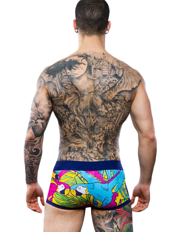 Nuevo modelo de calzoncillo de pierna corta, confeccionado en algodón elástizado y destaca por los modelos de tucanes y loros en colores muy vivos repartidos por toda la prenda.