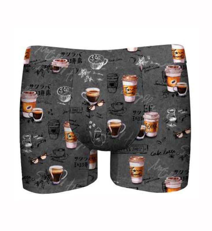 Su diseño presenta un original estampado de tazas y vasos de café "take away" sobre fondo gris, aportando un estilo moderno, actual y desenfadado inspirado en el ritmo urbano.