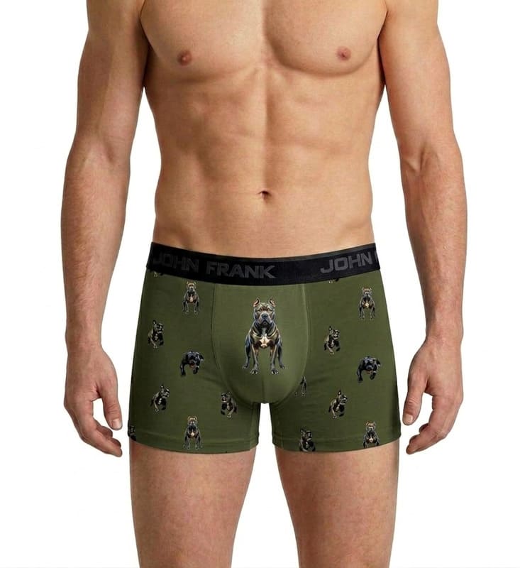 Su diseño en color verde botella, un tono elegante y sofisticado, presenta un distinguido estampado de perros Dogo, aportando un estilo único y lleno de personalidad. Este estampado se inspira en el carácter fuerte y leal de la raza, ofreciendo un look moderno y distinguido. Como novedad distintiva, incorpora un dogo en gran formato en la zona delantera de la prenda. (Realmente es un Pit Bull Terrier, pero es el nombre que le ha dado el diseñador de la marca).