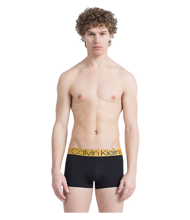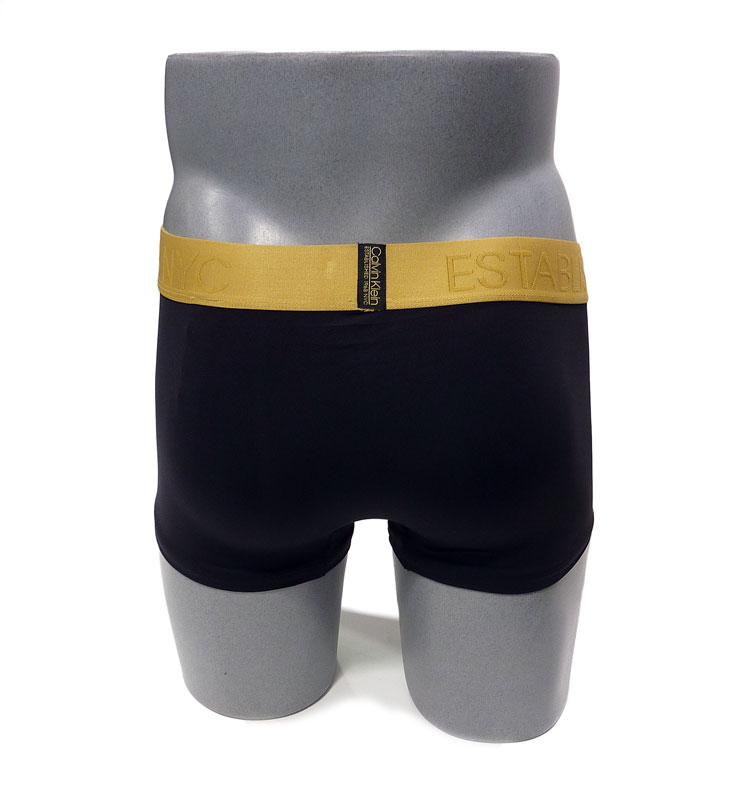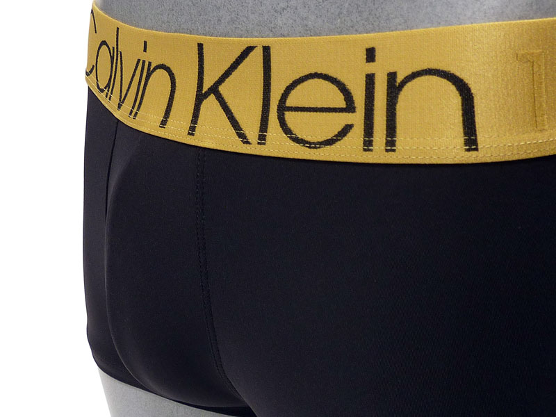 Goma vista en tono dorado, más ancha y haciendo un bonito contraste con el color de la prenda. Logo de Calvin Klein solamente en la parte delantera contrastando también en negro.