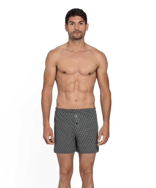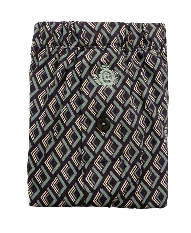 Calzoncillo de corte clásico de punto de algodón que no va ajustado al cuerpo. Este modelo está estampado con formas de rombos en marino, verde y detalles en blanco roto.