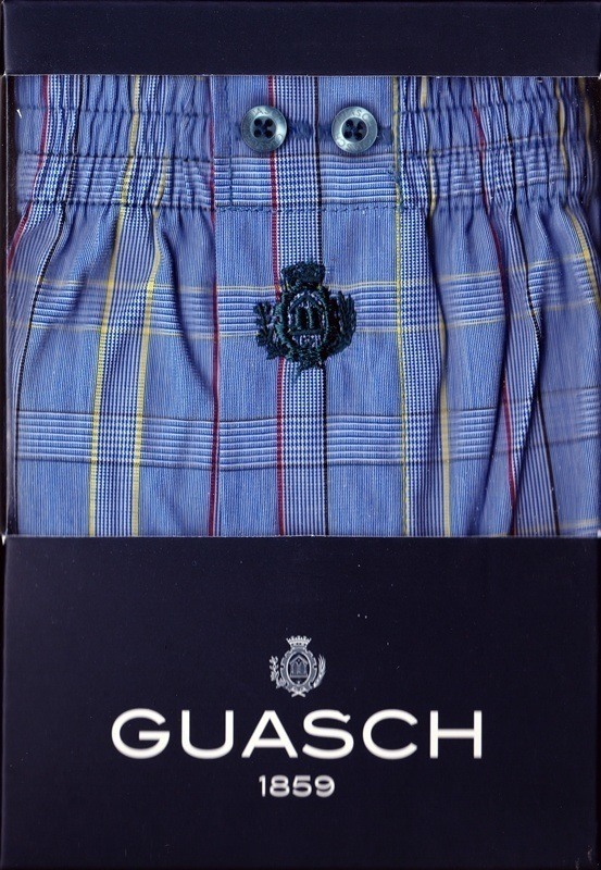Boxer de tela algodón popelín, en tono azul marino, rayas finas en diferentes tonos, amarillo y rojo.