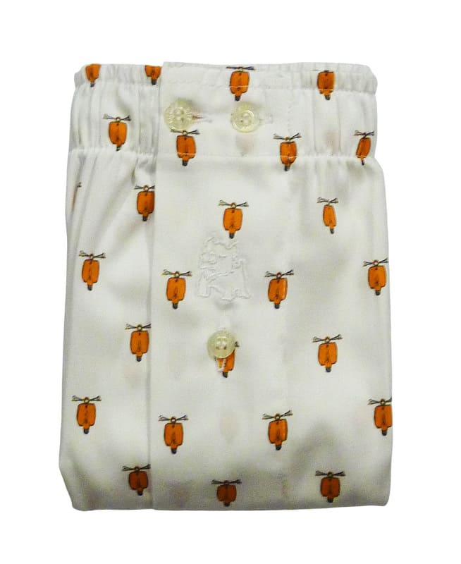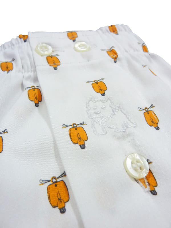 Su diseño combina un fondo blanco con motos clásicas en color naranja, creando un contraste atractivo y moderno. Incorpora bragueta con cierre de botón, cinturilla con doble botón ajustable y el icónico logo del perrito bordado en el frontal.