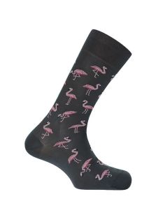Nuevo modelo de calcetín confeccionado en algodón mercerizado, que se caracteriza por ser más fuerte, suave y brillante que el algodón normal. Ademas los colores destacan más. Les presentamos un nuevo modelo con estampado informal de flamencos sobre diferentes colores de fondo: azul marino, verde y gris.