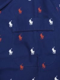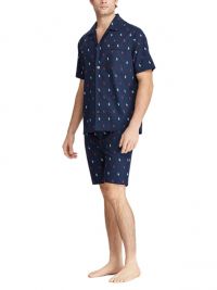 Pijama para hombre confeccionado en tela de algodón estampado con los logos de la marca, perfectamente contrastados sobre el clásico azul marino de Polo. Es una prenda pensada para usar en los meses más cálidos del año, principalmente.