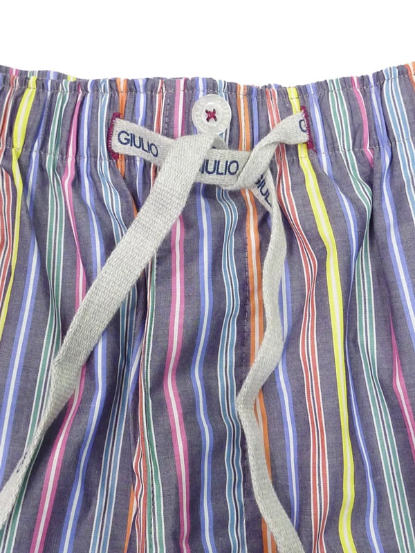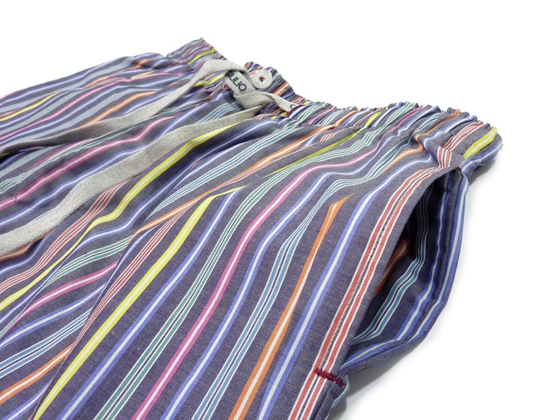 Pantalón del pijama en tela, a rayas combinando diferentes tonos, colores vivos como: narnaja, verde, fucsia... sobre fondo en gris. Cinturilla elástica forrada a juego que incluye cordón ceñidor y bolsillos laterales. No tiene abertura o bragueta.