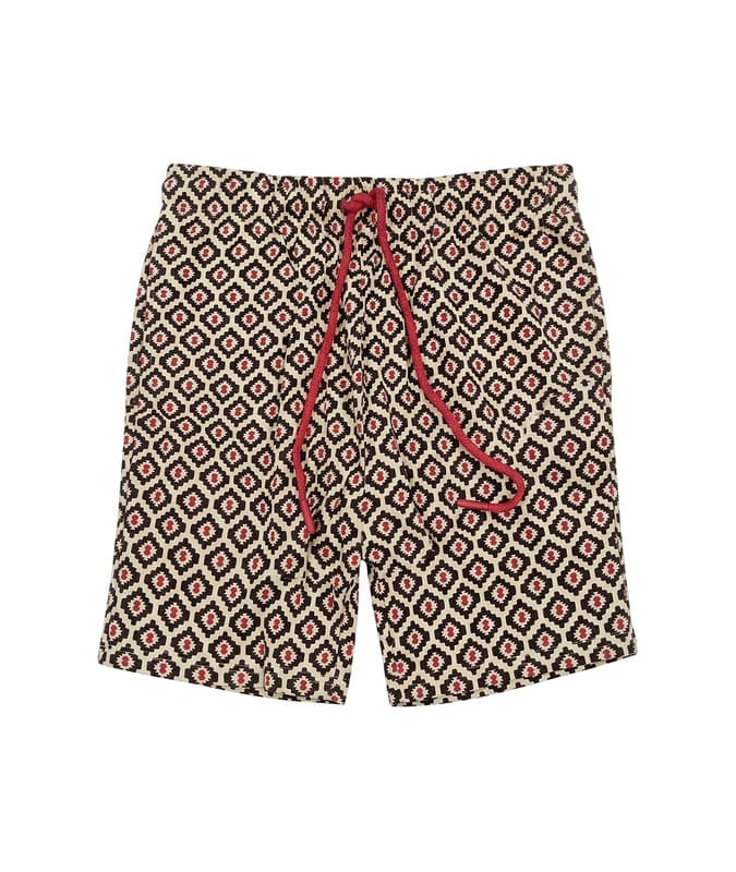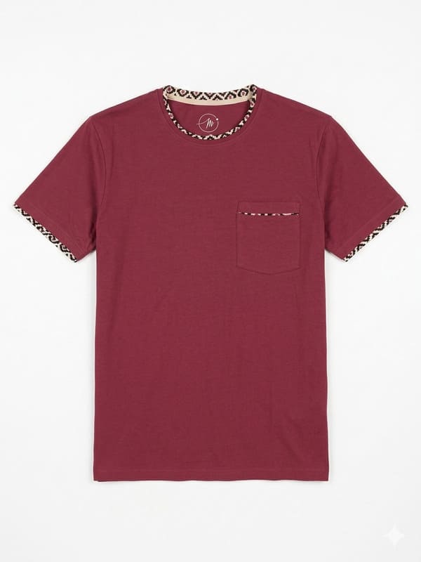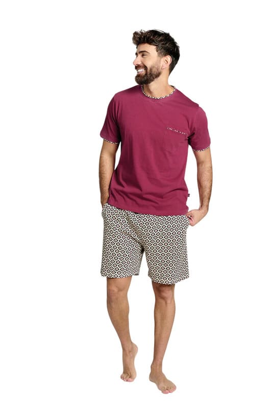 El conjunto se compone de una camiseta de manga corta en tono granate, con bolsillo en el pecho y acabados a contraste en cuello y mangas, que aportan un toque moderno, combinada con un pantalón corto estampado a juego. Además, el pantalón incorpora bolsillos laterales, ofreciendo practicidad y confort en el uso diario.