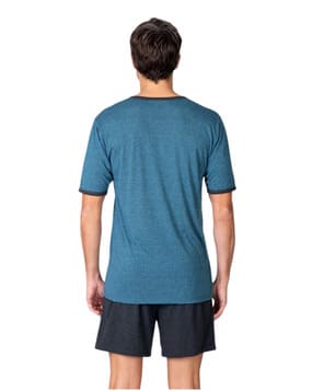 La camiseta de manga corta con efecto jaspeado incorpora cuello redondo y ribetes a contraste en mangas y cuello, junto con un estampado gráfico frontal que aporta un toque moderno. Confeccionado en tejido de punto con viscosa, ofrece un tacto extra suave y ligero, ideal para el descanso diario.