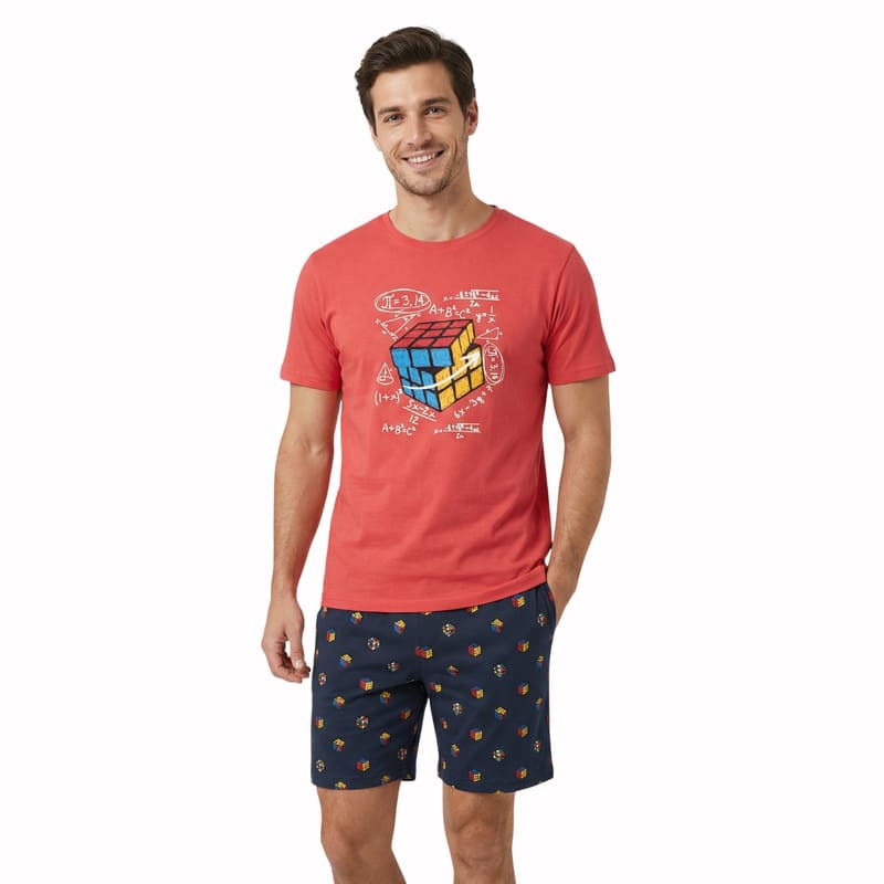 El pijama corto de hombre Dark Elephant modelo Cubo en color coral es una opción perfecta para quienes buscan comodidad, frescura y un diseño actual durante el verano.