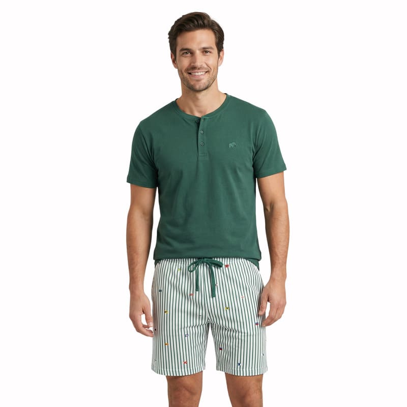 El pijama corto de hombre Dark Elephant en color verde es una opción ideal para quienes buscan comodidad, frescura y un estilo clásico con un toque actual.