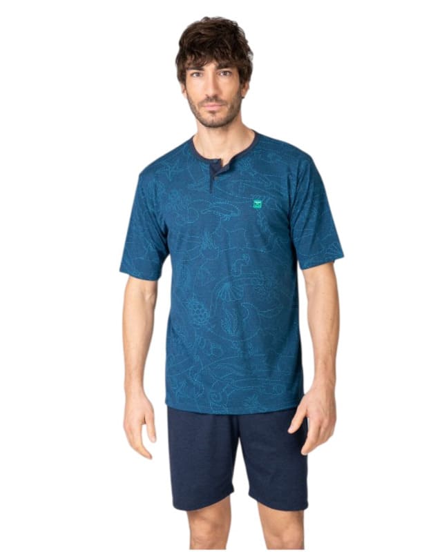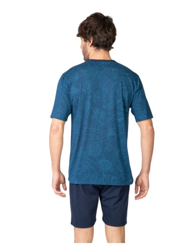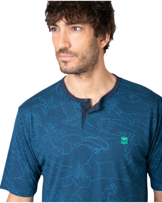 La camiseta de manga corta destaca por su estampado sutil de animales marinos sobre fondo azul, incorpora cuello con tapeta de botones que añade un toque sofisticado y cómodo al mismo tiempo. Gracias a la viscosa presente en el tejido, ofrece una sensación extra suave, mayor transpirabilidad y una caída ligera, perfecta para mantener el confort durante toda la noche.