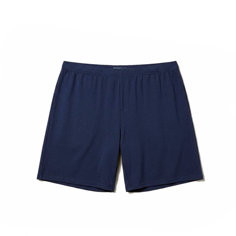 El pantalón corto liso, en tono azul marino jaspeado, equilibra el conjunto con un diseño limpio y funcional. Dispone de cintura elástica que se adapta cómodamente al cuerpo, sin cordón ni bolsillos, favoreciendo una experiencia de descanso más ligera.