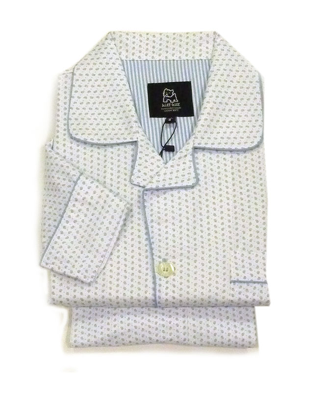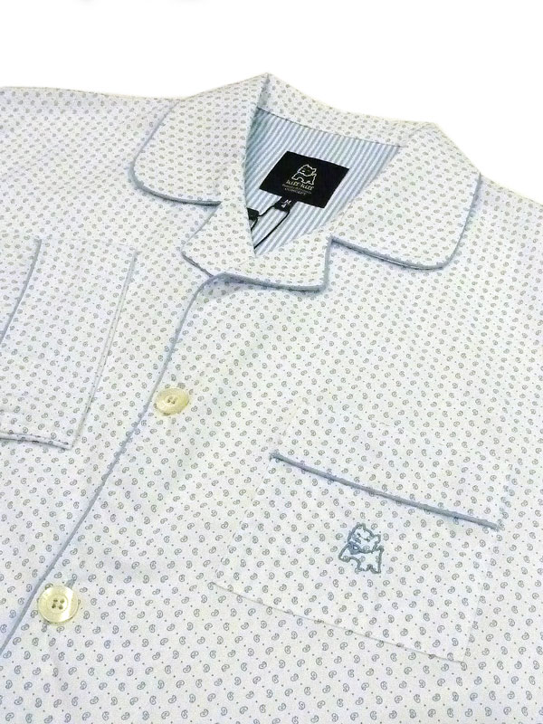 Camisero del pijama de manga larga, combinando topitos pequeños en azul claro contrastando con el blanco de la prenda. Estilo clásico, corte tipo camisa con botones y vivos a contraste en azul claro. Incluye bolsillos, también envivados, tanto en el pecho que va bordado con el perrito de la marca, como en los bajos del camisero.