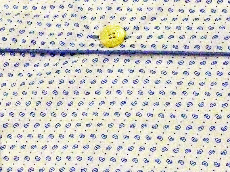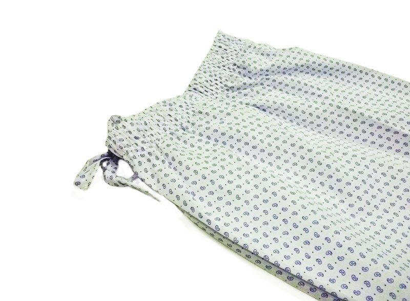 El Pantalón es largo, en tela de algodón y en los mismos tonos que el camisero. Cinturilla forrada a juego, goma elástica suave, cierra con un botón. Lleva cordón ceñidor pero no tiene bolsillos laterales. Tiene pitrina o abertura cerrada con un botón.