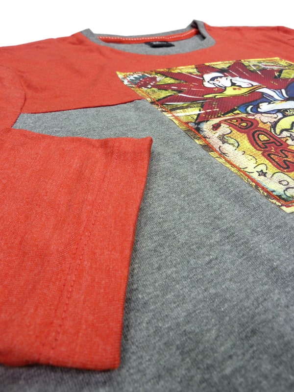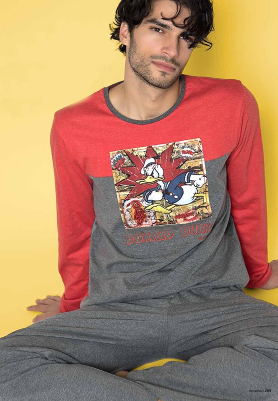 Camiseta Pijama en cuello redondo. Combinado a dos colores rojo y gris marengo. Estampación retro de Donald Duck en la pechera de la prenda sobre viñetas de un comic.
