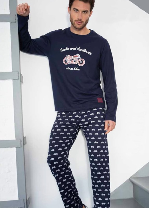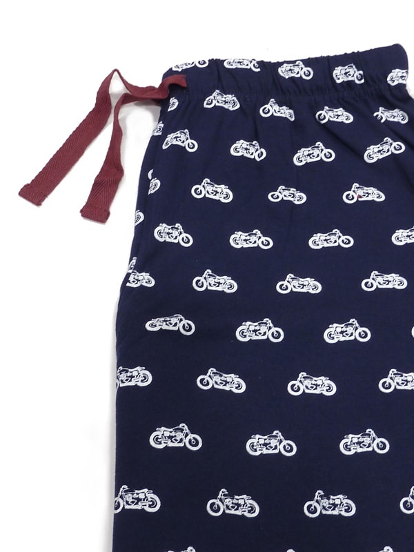 Pantalón pijama totalmente estampado con motocicletas contrastando en blanco sobre fondo en azul marino y a juego con la camiseta. Cinturilla elástica forrada, cordón ajustable sin bolsillos laterales.