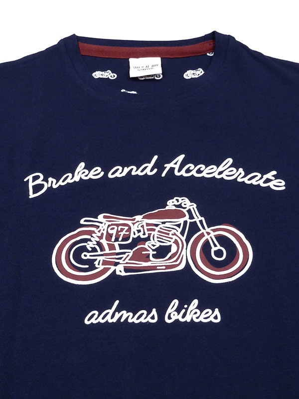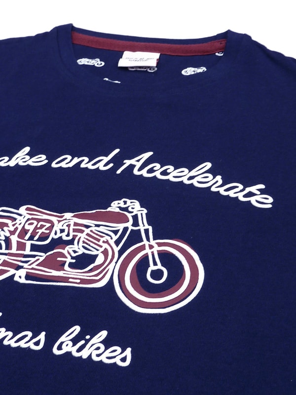 Camiseta pijama con cuello redondo y estampación engomada de una motocicleta a dos colores, blanco y granate, ligeramente en relieve.