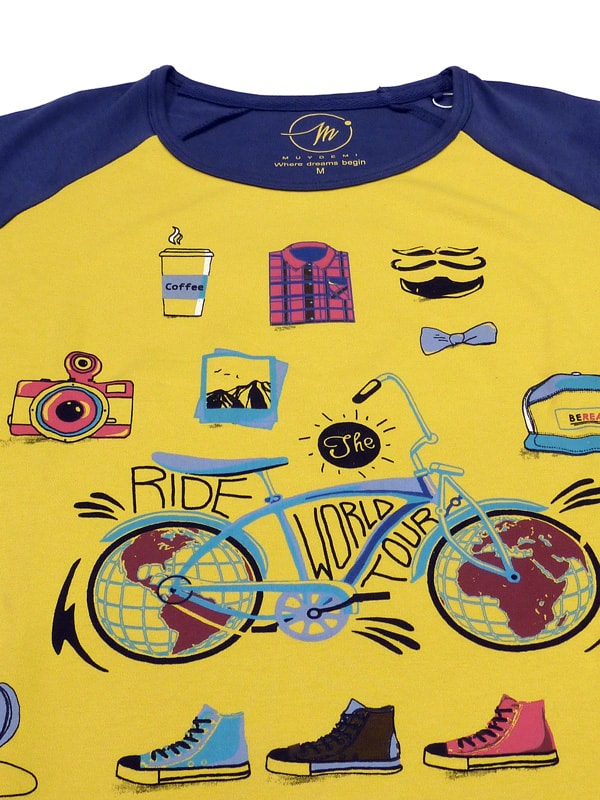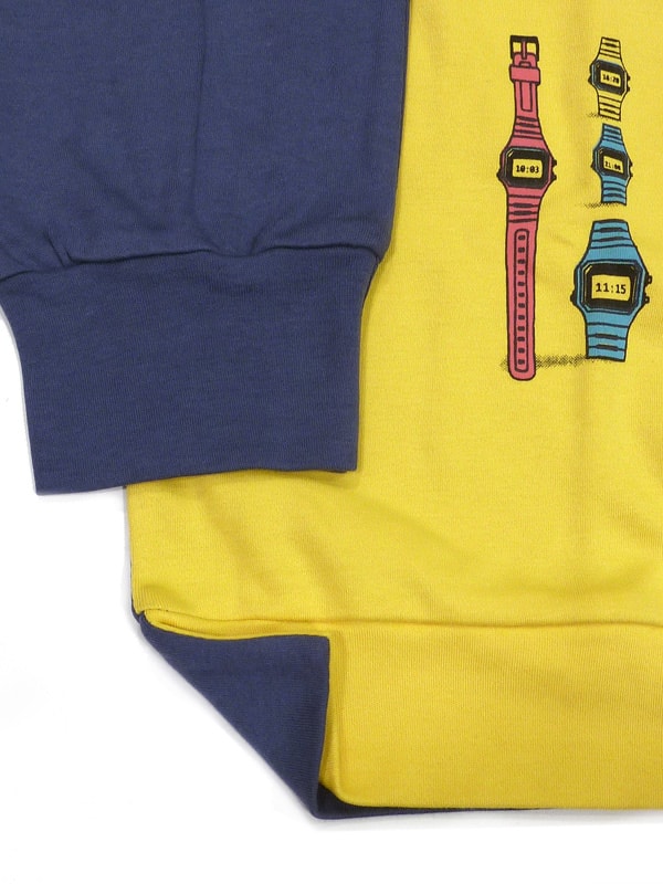 Camiseta de manga larga con cuello redondo a dos colores: en la parte frontal, amarillo con estampación de diferentes objetos "unicos" en su estilo y diseño... y por la parte trasera y haciendo juego con las mangas va en color azul acero. Tanto la camiseta como las mangas cierran con puños elásticos.