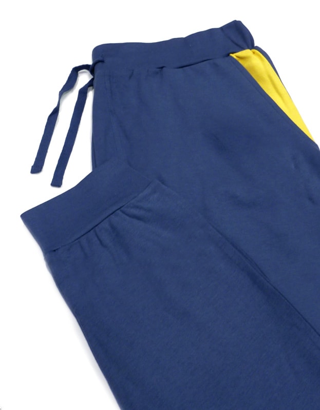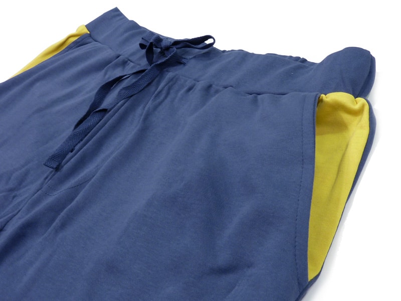 El pantalón es liso a juego. Lleva un detalle en amarillo en la parte de los bolsillos. Cinturilla elástica ancha forrada, lleva cordón ceñidor y bolsillos laterales. Las piernas cierran con puños elásticos.
