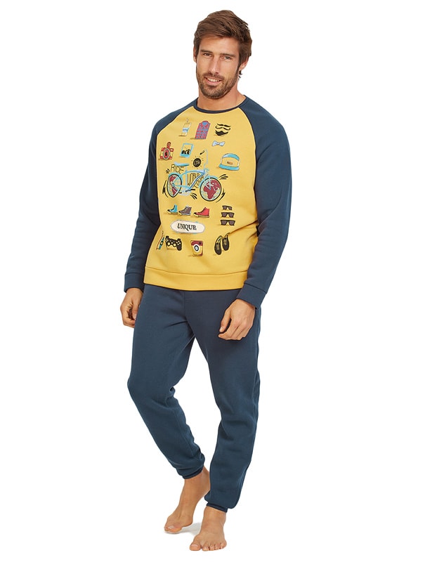 Esquijama para hombre de estilo juvenil e informal, confeccionado en algodón, tejido con un grosor intermedio, muy suave, gustoso al tacto y perfecto para usar durante todo el año.