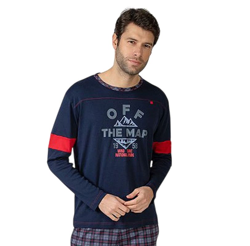 Camiseta en azul marino con acabado en cuello redondo envivado a juego con el pantalón. Estampado en el pecho y detalles contrastados en rojo para darle un acabado más informal y juvenil a la prenda.
