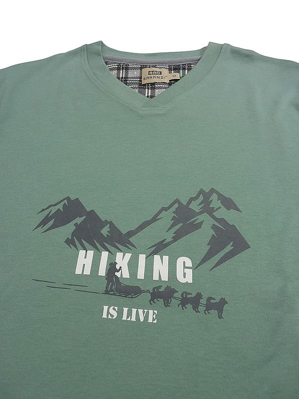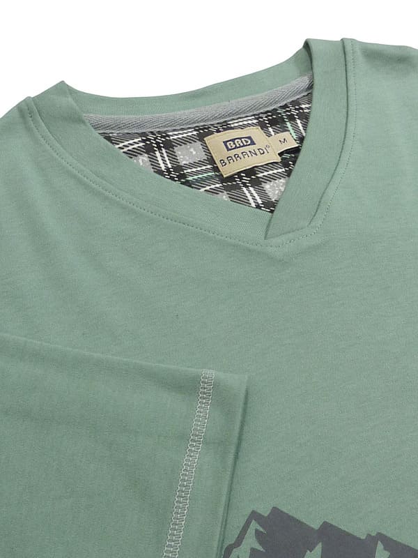 La camiseta es en verde claro de manga larga, cuello redondo y estampado posicional en el pecho de unas montañas.