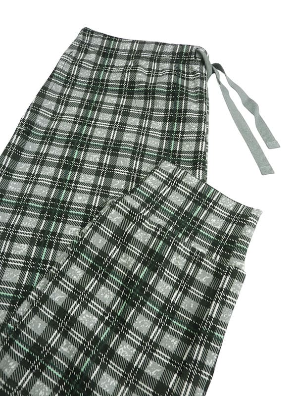 El pantalón está confeccionado en el mismo tejido y a cuadros combinados de blanco y negro con un pequeño vivo a juego con el color de la camiseta. Cinturilla elástica forrada a juego con cordón ceñidor y bolsillos laterales.