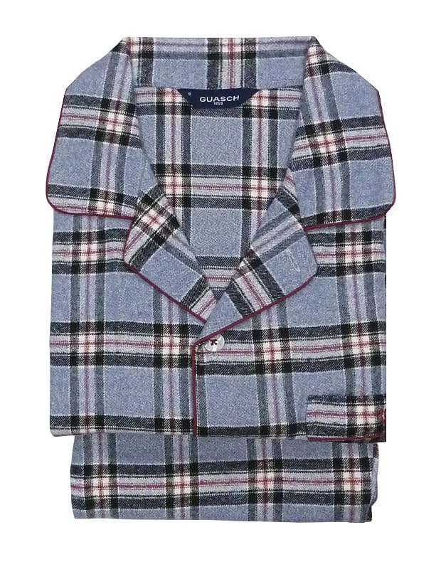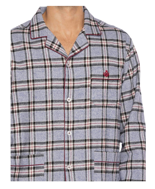 El camisero del pijama de formato clásico que cierra con botones, bolsillos tanto en el pecho como en los bajos, perfectamente casados y envivados en burdeos. Combina cuadros en blanco, burdeos y gris sobre el color base de la prenda que es azul.
