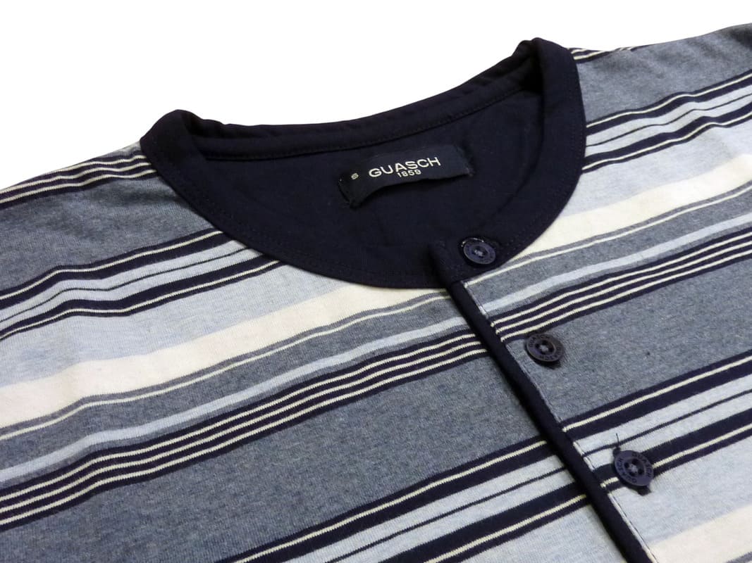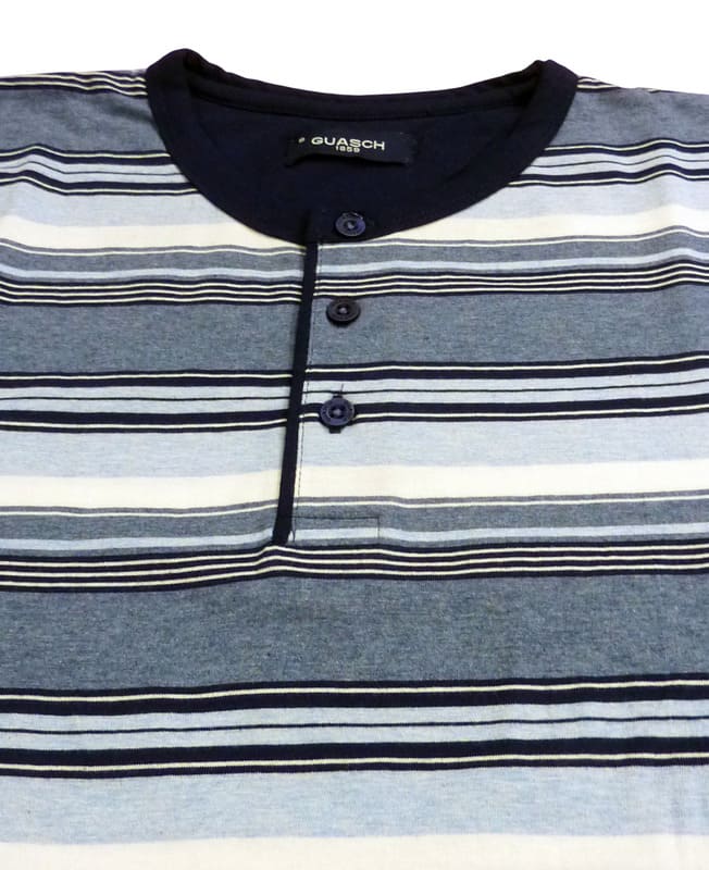 Camiseta a rayas en diferentes grosores y tonos azulados: marino, jeans, celeste ligeramente jaspeados hasta el blanco. El tejido de algodón suave la hace muy cómoda. El cuello es redondo y cierra en una tapeta con tres botones.