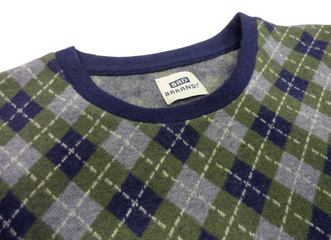 La camiseta presenta un bonito estampado geométrico de rombos en tonos verde, gris y azul marino. Cuenta con cuello redondo envivado a juego.