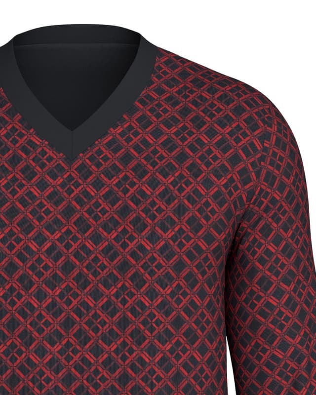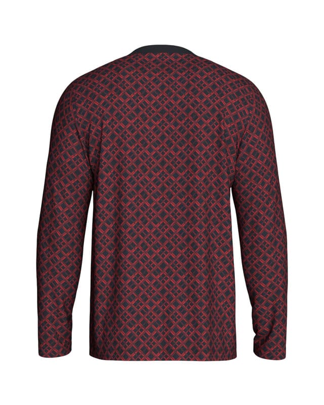 Camiseta de manga larga con estampado de cuadros en rojo y azul marino. Cuello en pico, no muy escotado envivado a juego con el tono del pantalón.