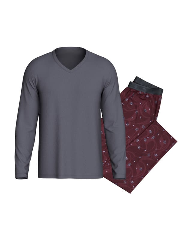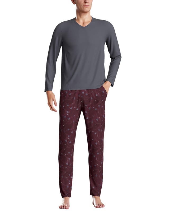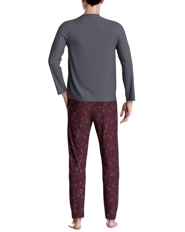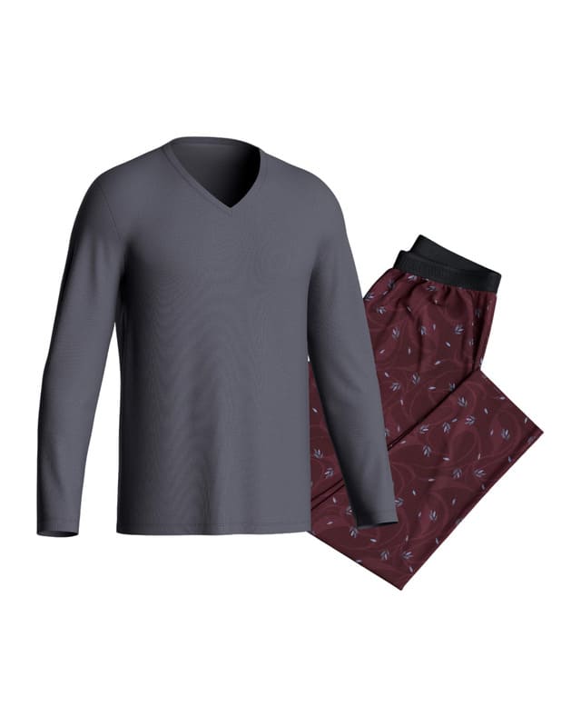 Pantalón largo con estampado vegetal sobre color burdeos. Cuenta con goma vista o cinturilla elástica en marino sin cordón ceñidor pero incluye bolsillos laterales.