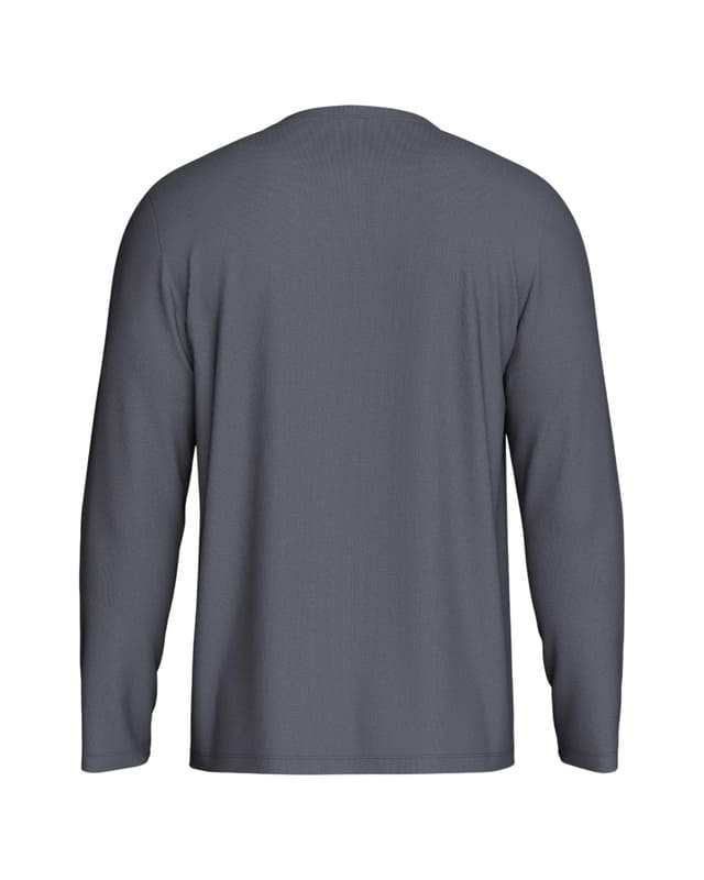 Camiseta de manga larga lisa en gris. Cuello pico, ligeramente cerrado, no escotado.