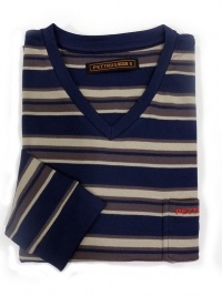 Camiseta de manga larga a rayas con cuello pico, bolsillo en el pecho con el logo de la marca bordado. Combinado a rayas en tonos marino sobre beige y marrón. Tiene puños cerrando las mangas.
