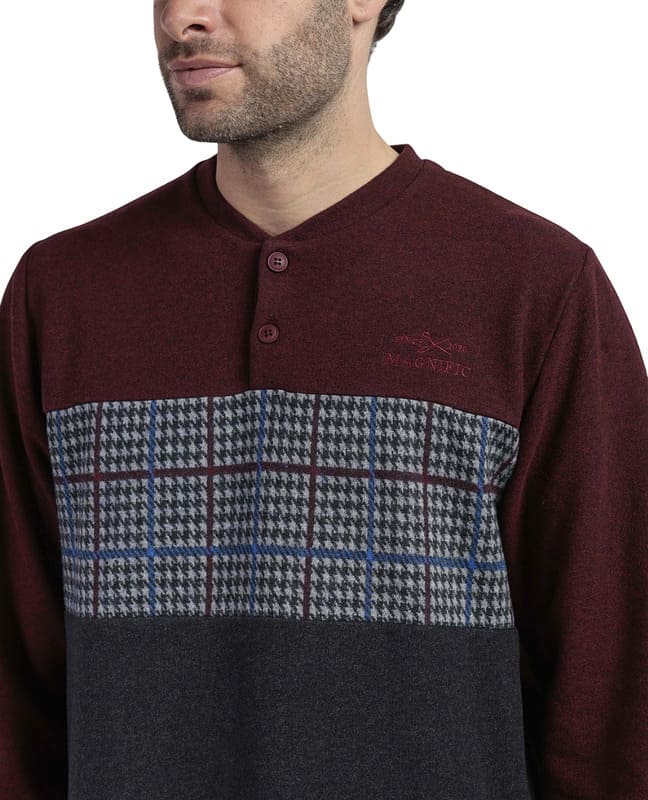 La camiseta en color granate, con detalle en el pecho con acabado en "pata de gallo" que le aportan un toque distintivo al diseño. Cuello redondo que cierra en tapeta con dos botones. Las mangas cierran con puños elásticos a juego.